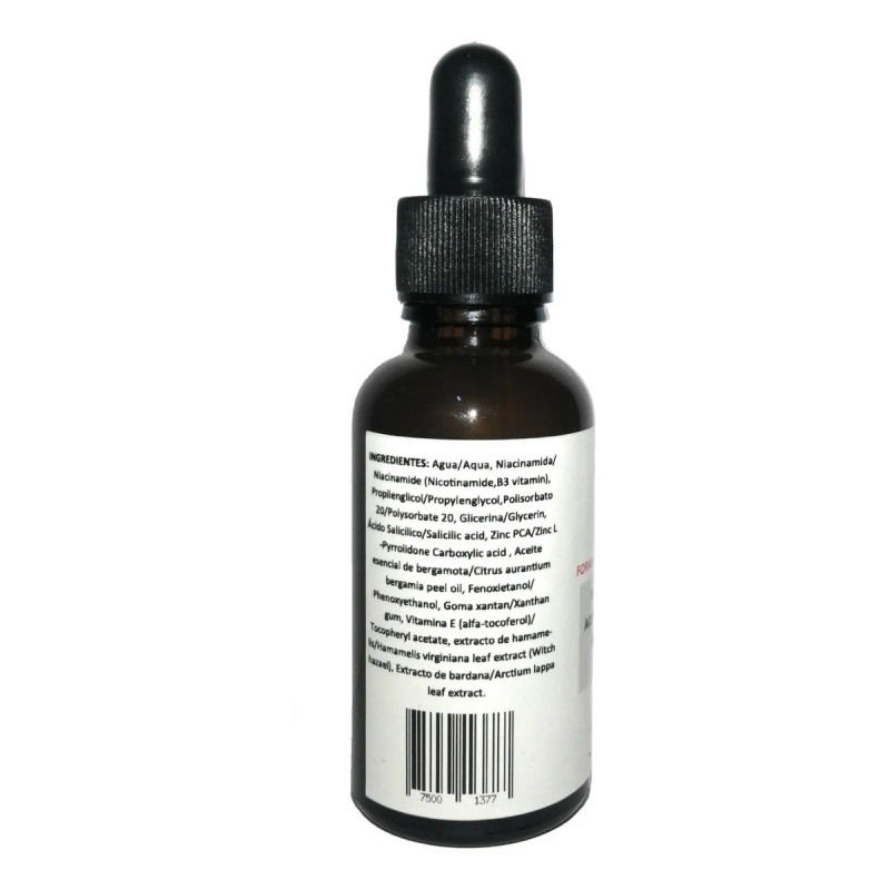 SERUM,SUERO , NIACINAMIDA 10%, ACEITE DE BERGAMOTA 1%, ÁCIDO SALICILICO 1%, ZINC PCA 3%, LIMPIADOR FACIAL, HIDRATANTE, LUMINOSIDAD Y UNIFICACIÓN DE TONO DE PIEL, SEBORREGULADOR.