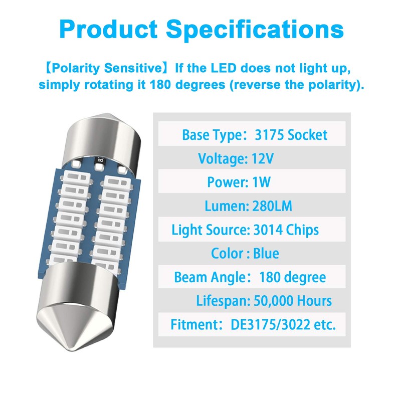 - ✔【High Quality & Low Power】Set of 4pcs 3175 led Festoon bulbs,Ultra Blue, Bulb size: 1.22" x 0.33",Working voltage: 12V . Give your vehicle upgraded LED interior lights for a more modern and bright style!