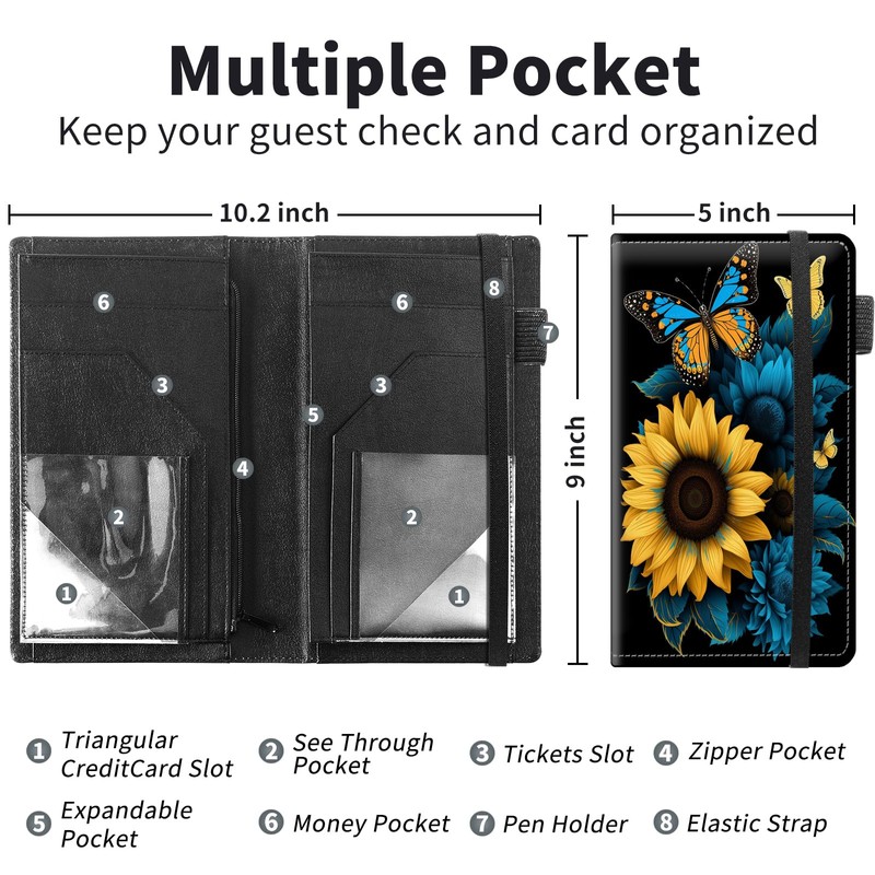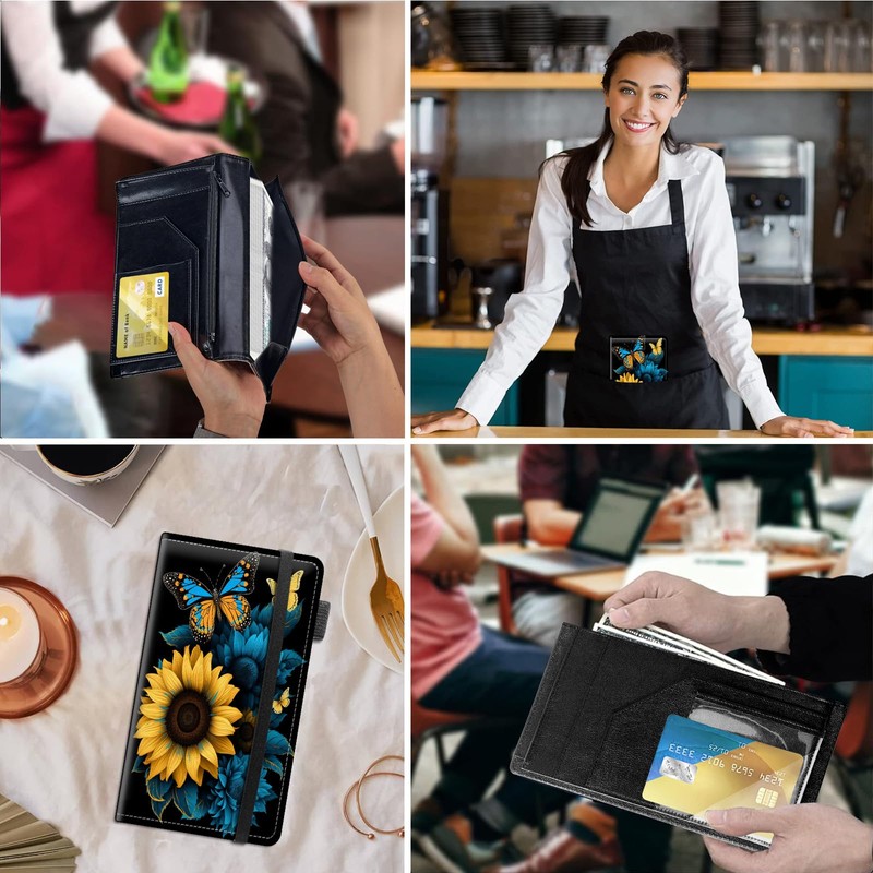 Server Books for Waitress Book,Leather Server Book with Zipper Pocket,Fit Waitress Apron,Guest Check Books for Servers Notepad Check Presenters for Restaurants 5" x 9",Sunflower Butterfly