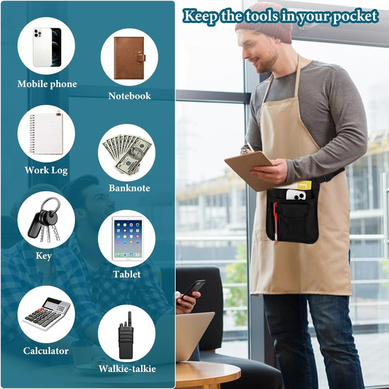 - Multi-Pockets: Our server waist apron comes with 4 pockets of different sizes, depth and types, 2 pen holders, for holding pens, phone, server book, mini iPad, mic box, check, money etc..Our small pocket comes with hooks, you can hang your work badge and keys, easy to reach and store.