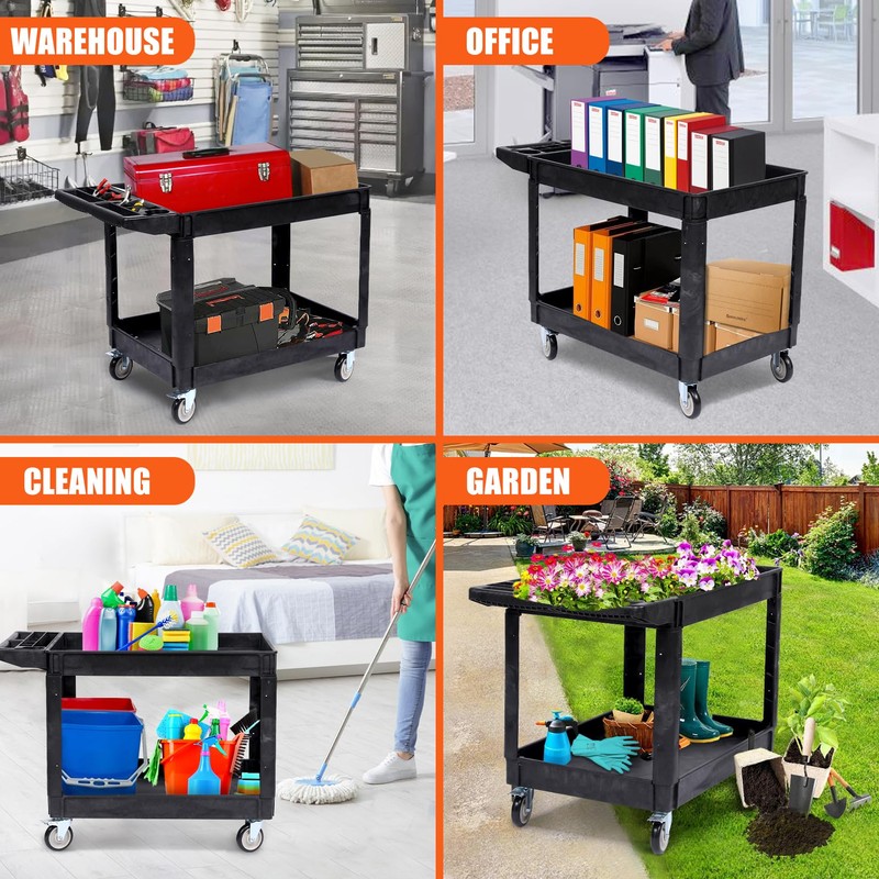 Service Cart, 550LBS 2-Shelf Heavy Duty PP Rolling Utility Cart with 360° Swivel Wheels, Large Shelf, Storage Handle, for Warehouse/Garage/Cleaning