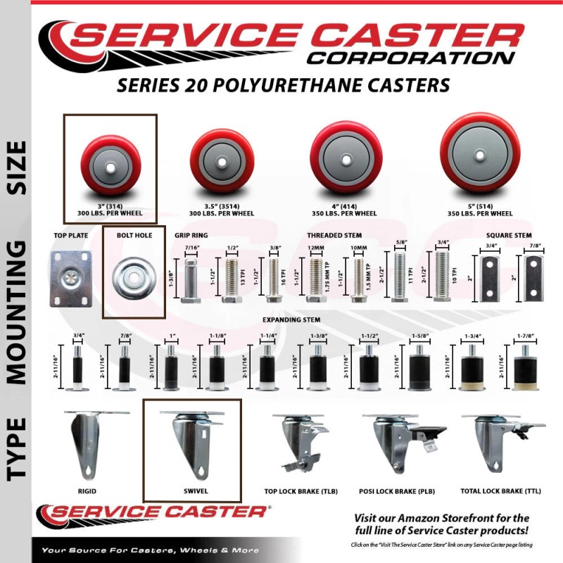 Listing is for one (1) Service Caster Series #20 Creeper swivel caster with a 3" diameter by 1-1/4" wide red polyurethane wheel and a bolt hole capable of supporting 300 lbs./caster.