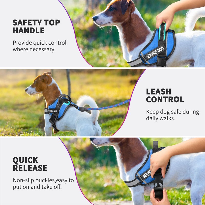 - SAFETY FIRST: Our service dog harness is made of high-quality and sturdy nylon material, which is not easy to tear and provides ultimate durability for the safety of your puppy. The improved padded handle and reflective material have increased visibility, and you can believe that we will prioritize the safety of your dog in all your walks