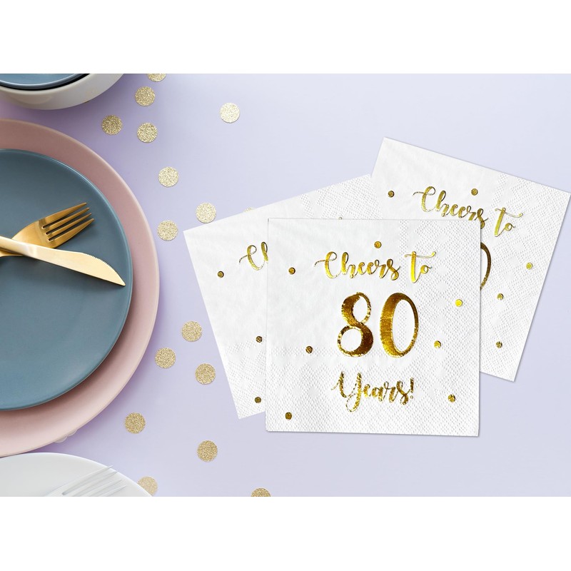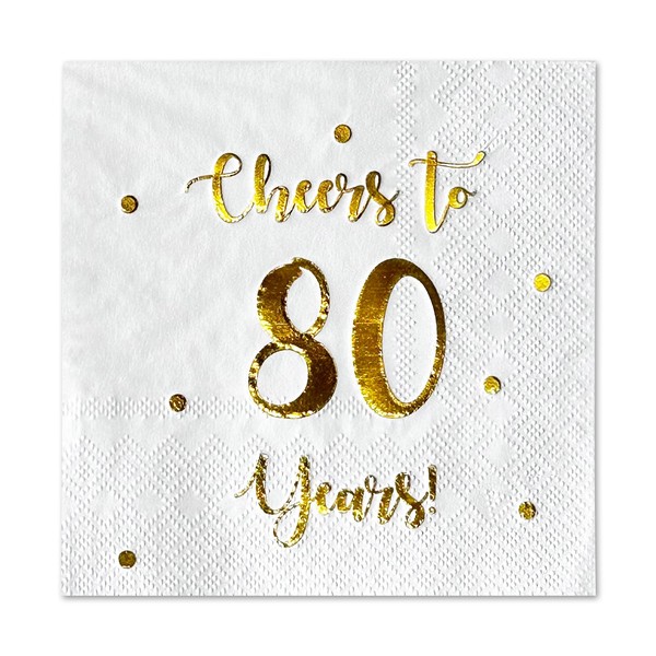 • El juego incluye: 50 servilletas de papel blanco de alta calidad con texto y puntos clásicos de lámina dorada "Cheers to 80 years". Las celebraciones de 80 años ocurren una vez en la vida, celebrarlas con buen gusto
