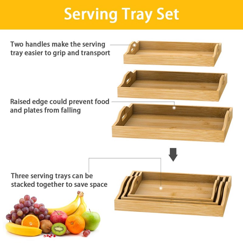 - 100% BAMBOO: our serving trays are all made of bamboo,which is known as a kind of renewable material,eco-friendly and durable;add natural touch to your home
