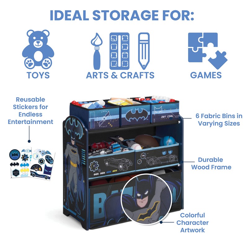 - TONS OF STORAGE: 6 fabric bins in 3 sizes provide storage for toys big and small