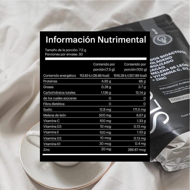- Colágeno Hidrolizado BLACK Fórmula creada para hombres y mujeres muy activos y que disfrutan sentirse con energía, personas que desean mejorar su rendimiento físico y requieren una concentración especial en las actividades que realizan. CARACTERÍSTICAS Sin Azúcar Sin Gluten Sin Lácteos Sin Olor Sin Conservadores Sin Maltodextrina INGREDIENTES Péptidos bioactivos de colágeno hidrolizado, Cacao, Melena de León, Vitamina C, D3, E y K, Zinc. Sin lácteos, sin gluten, sin saborizantes artificiales, sin maltodextrina. APARIENCIA Polvo de color y olor característico. INDICACIONES DE USO Mezcla 1 scoops diario (7.5 g) con tu bebida favorita. PRECAUCIONES Este producto no es un medicamento. El consumo de este producto es responsabilidad de quien lo recomienda y quien lo usa. Consulta a tu médico antes de consumirlo en caso de embarazo, lactancia o alguna condición médica. No se consuma en caso de hipersensibilidad a la fórmula. Debes conservarse en un lugar fresco y seco. CONTENIDO Bolsa con 225 gramos. Aviso legal