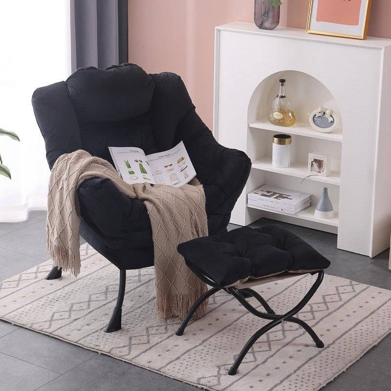 SESHINELL Lazy Chair with Ottoman, Modern Accent Chair Contemporary Lounge Leisure Sofa Chair with Armrests, Reading Chair and Folding Footstool Set for Living Room, Bedroom, Office, Black