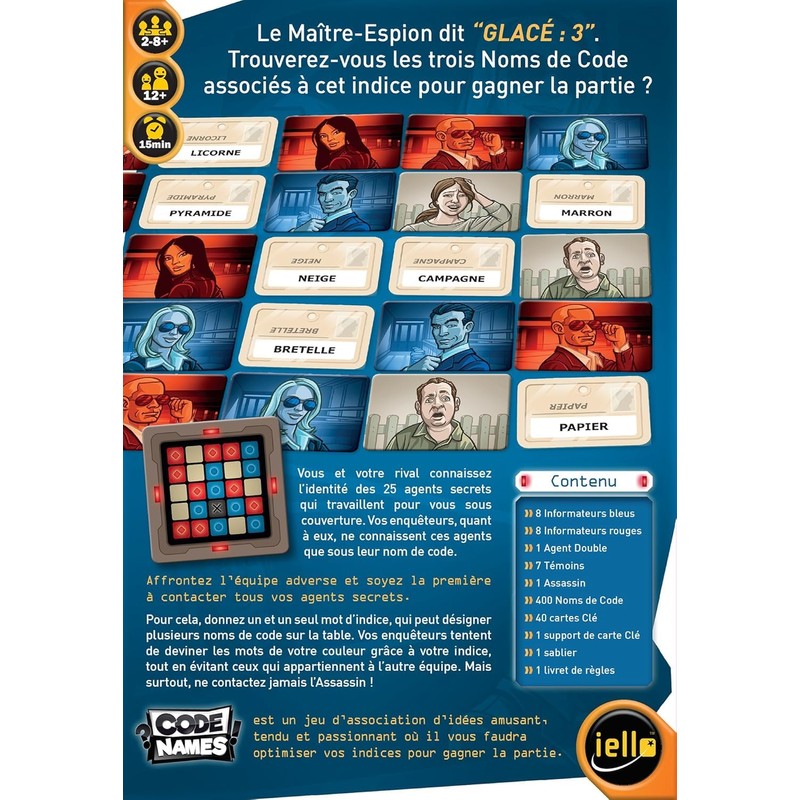 • Codenames is a fine and original idea association game. The two Spy Master know the identities of the 25 informants on the table, but their agents only see their code names.