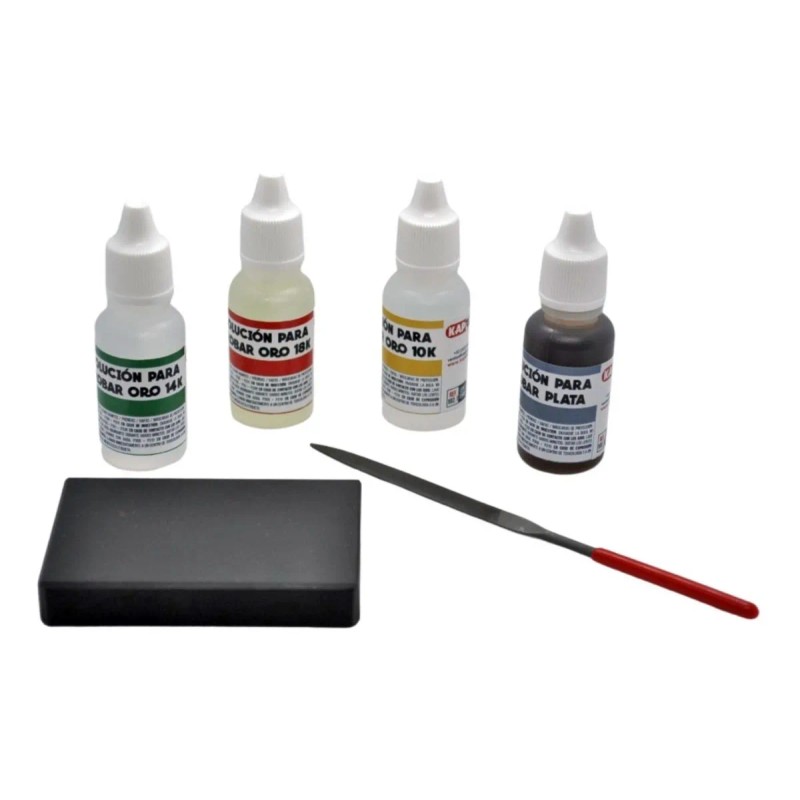 Ideal para joyeros, orfebres, compradores de oro y entusiastas de la metales, este kit completo te permite identificar la pureza del oro y plata, además de limpiar y trabajar tus piezas con precisión.