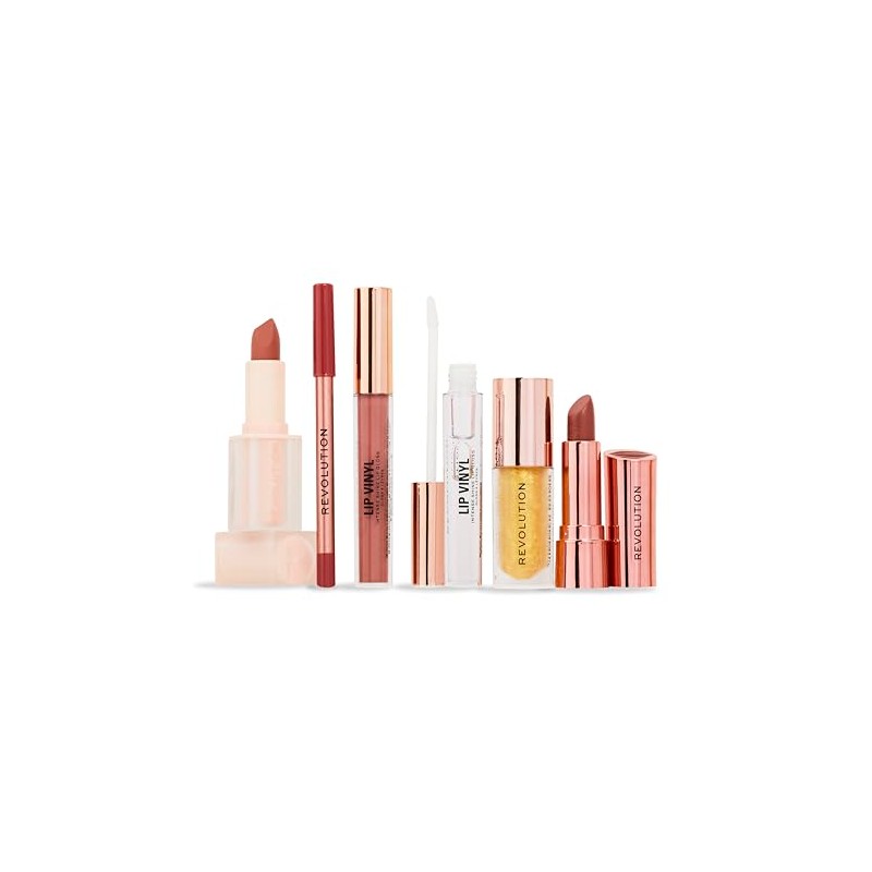 - Esto es lo que encontrarás dentro de este set de regalo de seis piezas para labios nude: 1 x Revolution Satin Kiss Lipliner Chauffer Nude: un delineador de labios supersuave y de pigmentación intensa que combina perfectamente con nuestros labiales Satin Kiss. 1 x Revolution Satin Kiss Lipstick Chauffer Nude : un acabado aterciopelado rico y cremoso. 1 x Revolution Lip Allure Soft Satin Lipstick Chauffer Nude. 1 x Revolution Vinyl Lipgloss: Chauffeur Nude. 1 x Revolution Vinyl Lipgloss: transparente. 1 x Revolution Shimmer Bomb: Light Catcher: este brillo transparente esta enriquecido con vitamina E para una nutrición adicional.