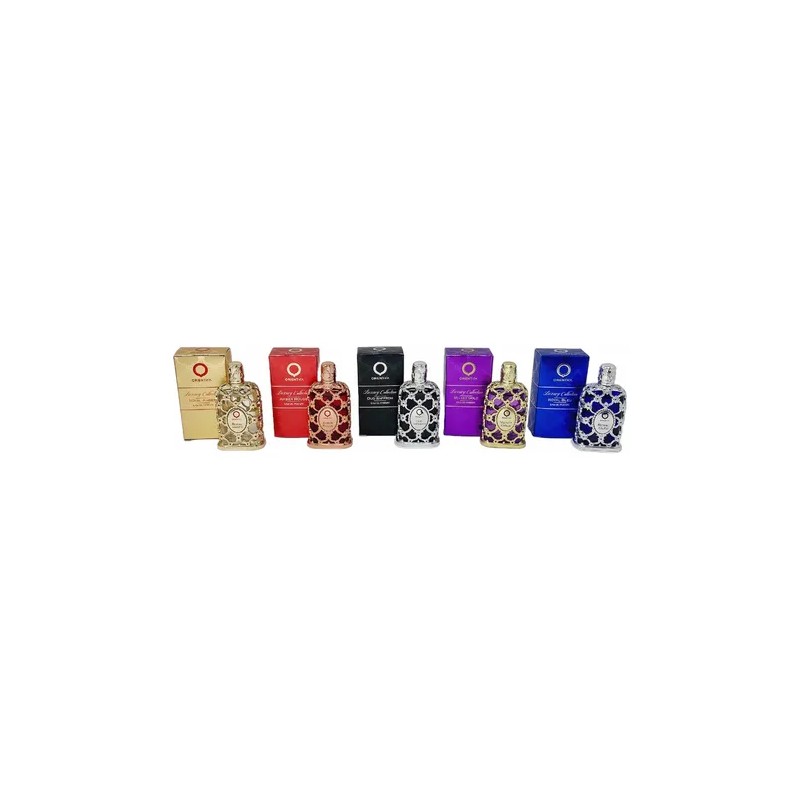 El Set Mini Orientica Luxury Collection consta de 5 miniaturas de 7,5 ml cada una. Este conjunto incluye 5 perfumes en miniatura de la línea de lujo: Royal Ambar, Royal Bleu, Velvet Gold, Old Saffron y Amber Rouge.