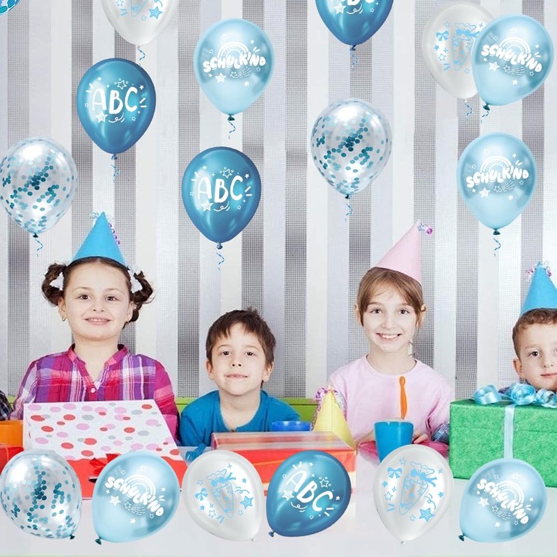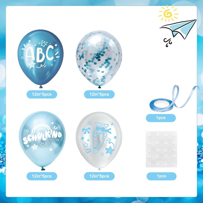 - Lieferumfang: 20 pcs Luftballons für Einschulung Party (Metallic-Blau*5, Himmelblau*5, Weiß*5, Glitzer-Blau*5) und 2 Rolle 10m lang weiße Bänder.