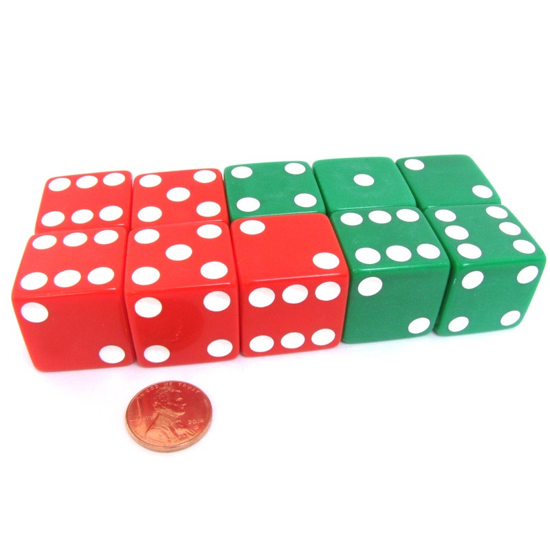 Set of 10 D6 25mm Large Opaque Jumbo Christmas Dice - 5 Each of Red and Green by Koplow Games