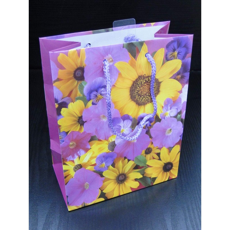 Set of 12 bagland gift bags in 4 designs, sizes 18 cm x 23 cm x 10 cm. The glossy surface of the bags presents attractive flowers in many angles and colours