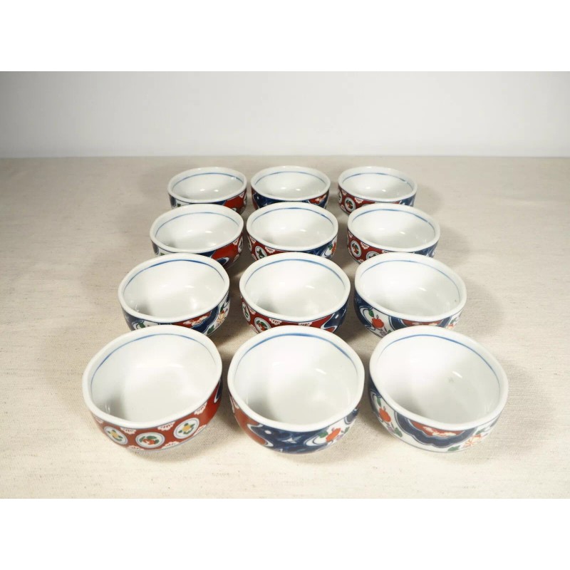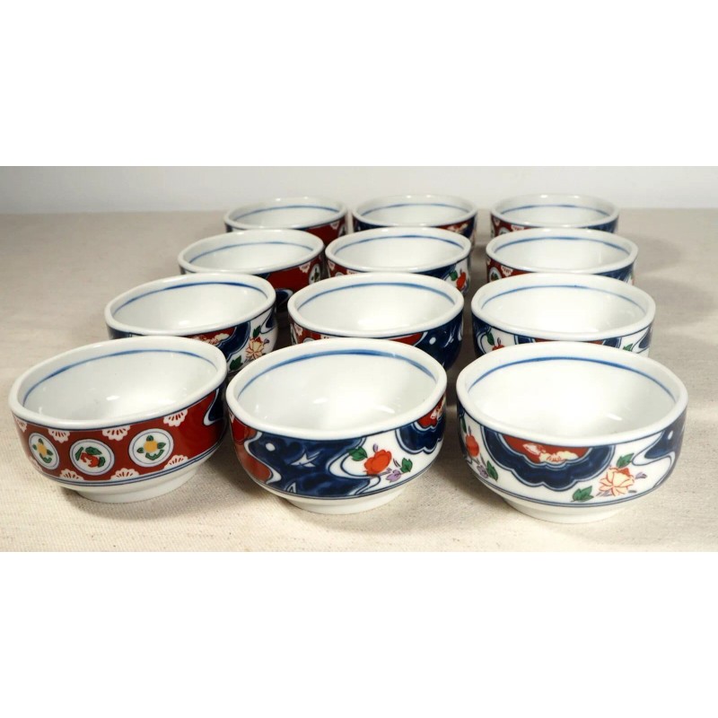 New Japanese Made Ceramic Bowl Set of 12. Round bottom with a slightly octagonal upper lip. Nicely made in Japan with all matching patterns. Gold leaf accent with traditional design. Each bowl measures: 3 1/4" wide x 1 3/4" tall. Please check the photos.