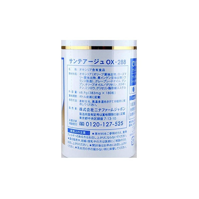 - Santeage OX-288 (supplement capsule type) Santeage OX Kneebee OX-288 is formulated with an exclusive ingredient of Oxilia (contains oxyria biota) Metabolite (fermentation metabolite) has been derived using fermentation technology using Chisjuu olive microbiota, which is over 1,000 years of tree, which is derived from 3 types of plants, including olive leaf, rosemary leaf, and black ingen beans, and works with synergistic effects. A new aging care approach to supporting your future with an everlasting youthful and healthy lifestyle