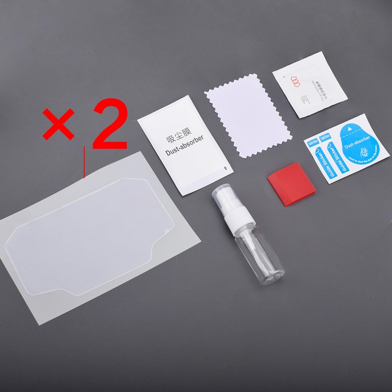 【Package Contents】: ■Protective film x 2 sets; Cleaning accessory kit x 1: 1. Guide sticker (temporary stickers) x 3 2. Dust absorber x 1 3. Squeegee (bubble spatula) x 1 4. Wet wipes (cleaning wet sheet) x 1 5. Cleaning cloth (removing dirt and grease) x 1"