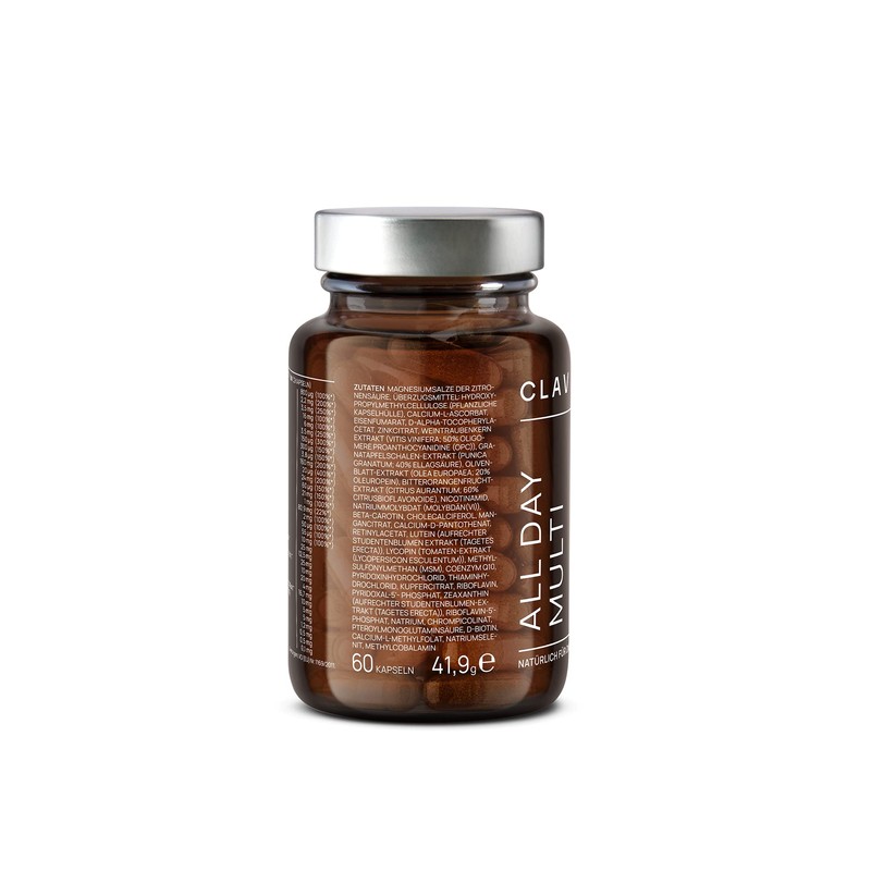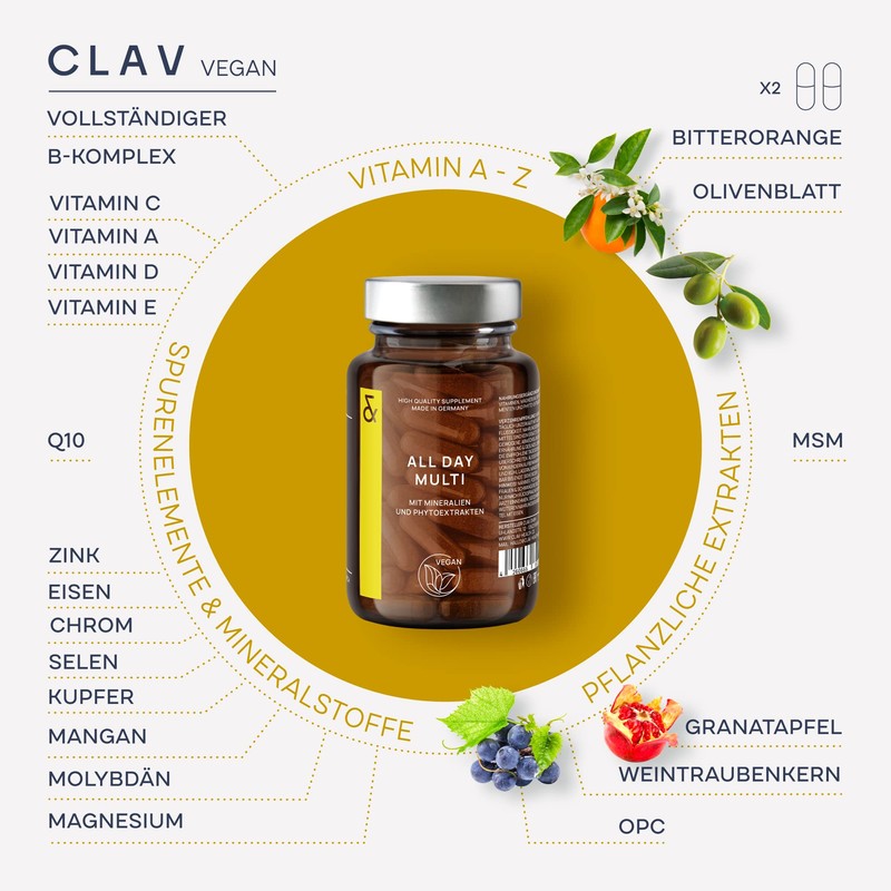 - Vitamins and minerals high dosage – with CLAVs All Day Multi you cover your daily requirement for many important vitamins. We supplement your diet daily with vitamin A to Z: vitamin A, vitamin D, vitamin E, vitamin C and a comprehensive vitamin B complex.