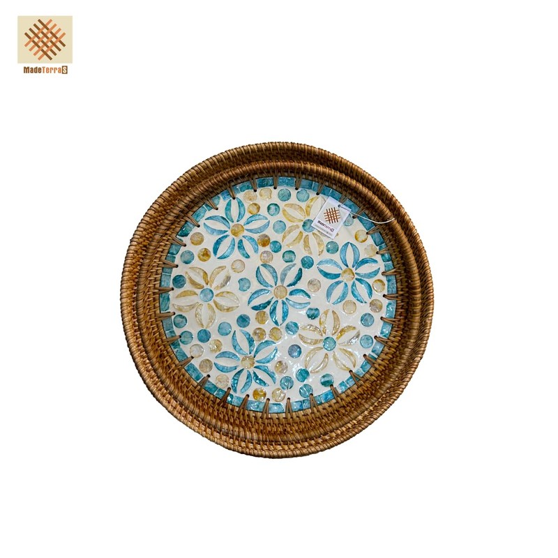 Round rattan tray with mother of pearl Set of 2 pcs with size: D 11.81 x 1.18 " (inside D 10.24" mother of pearl) D 13.38 x 1.57" (inside D11.81" mother of pearl)