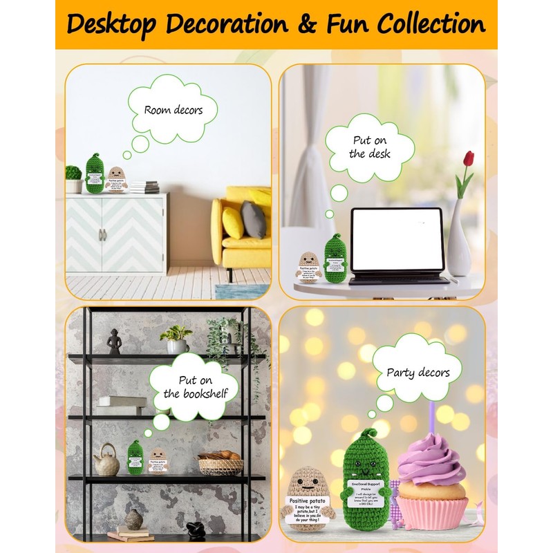- 1. Positive support for every moment. The positive potato and the emotional support cucumber are more than just cute figures. These hand-knitted dolls bring encouraging messages and serve as courage for difficult times. With heartfelt words on the enclosed cards, they are the perfect reminder to never give up. Whether at school, in the office or at home, they stand still by your side and spread positive energy.