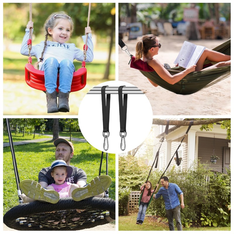 - You will receive: swing hanging strap kit contains everything you need for installation. The kit contains 2 x 50 x 2.5 cm swing connection straps, 2 x 6 x 2.8 cm climbing buckles. It can be used for outdoor playground, garden, home decoration, such as: patio swing, porch swing, hammock, baby carrier swing and so on.