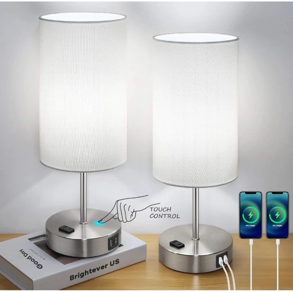 Set of 2 Touch Control Table Lamps with 2 USB Charging Ports&AC Outlet, 3-Way Dimmable Bedside Nightstand Lamps with White Fabric Lampshade for Reading, Bedroom, Living Room, A19 LED Bulbs Included