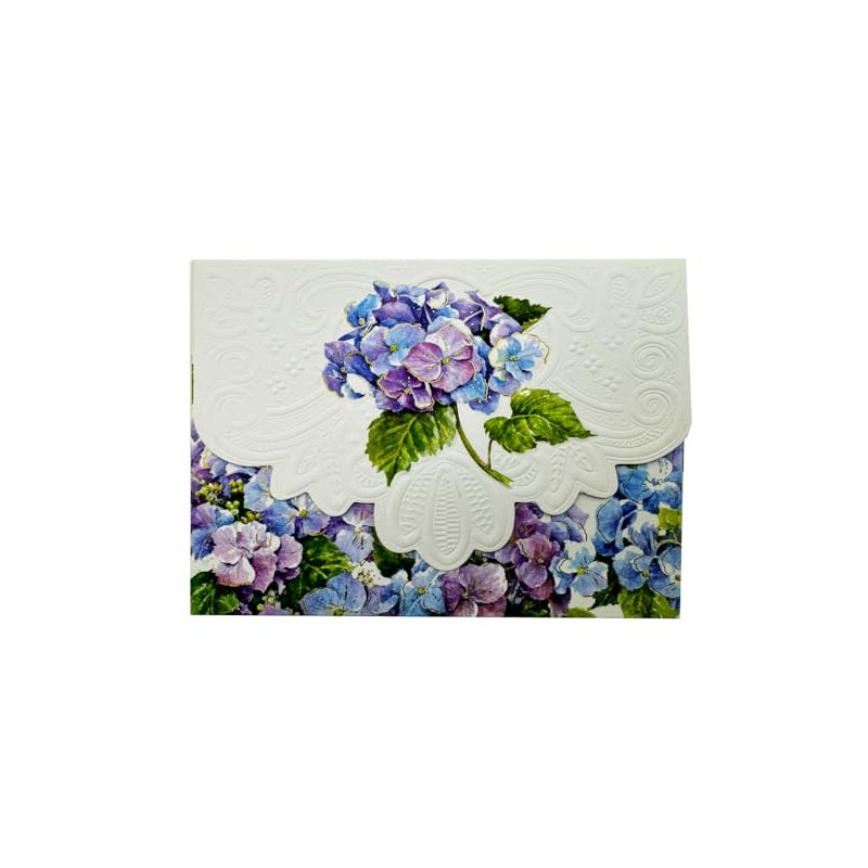 Blue Hydrangea Portfolio Boxed Note Cards by Carol Wilson. 10 embossed 4x5 Die-Cut Notecards and Matching Envelopes in Decorative Gift Box with Magnetic Flap. NCP2101