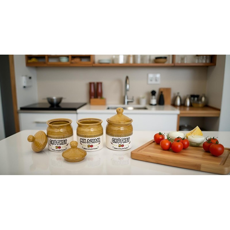 Set of 3 Ceramic Pickle & Chutney Jars With Lid - 10 Oz (300 ml) – Glazed Condiment Holder For Kitchen Counter, Food Storage Container for Spices, Sauces – Rustic Farmhouse Home Dining Table Decor