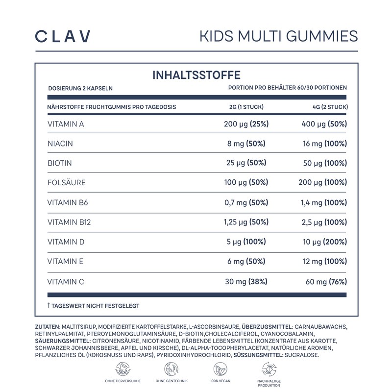 - Vitamins and minerals high dosage – with CLAVs All Day Multi you cover your daily requirement for many important vitamins. We supplement your diet daily with vitamin A to Z: vitamin A, vitamin D, vitamin E, vitamin C and a comprehensive vitamin B complex.