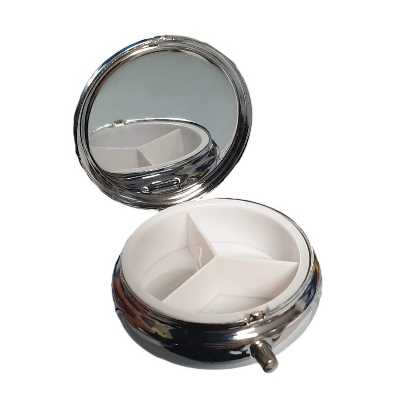 - Made of sturdy metal construction with plastic inner dividers. An elegant pill box storage with a high gloss image and a reliable spring closure that keeps your medication safe inside.