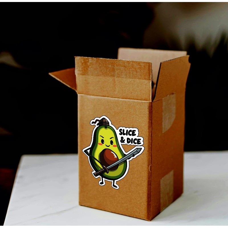 - DESIGN: Humorous avocado warrior character with samurai sword and hat, featuring 'Slice & Dice' text in bold lettering