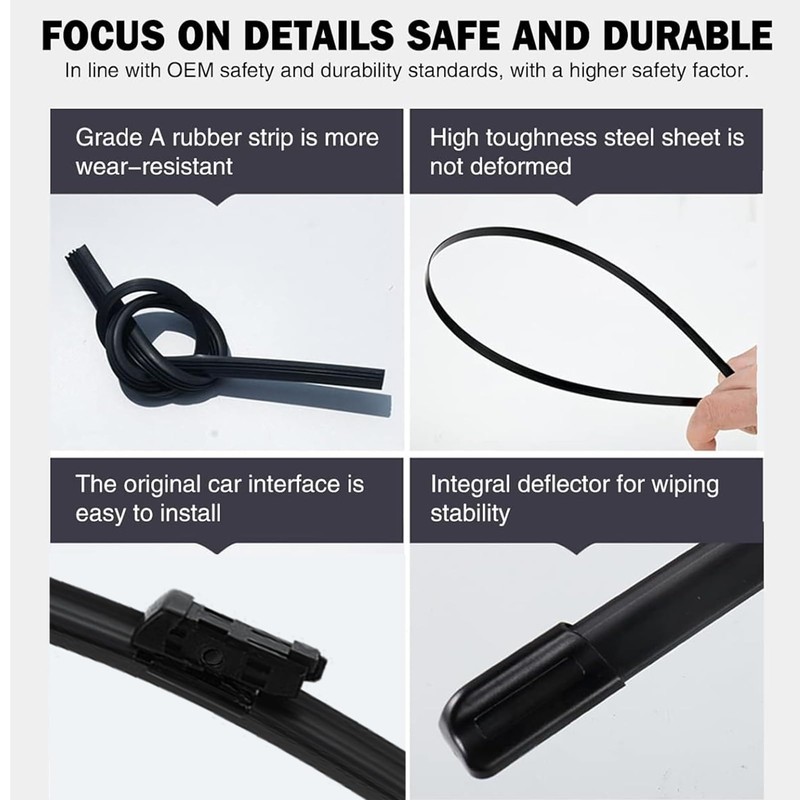 - Better vision, safer: the windscreen wipers we have developed using advanced technology ensure clear vision and safe driving. It can maintain optimal contact with the windscreen surface, dissipate water efficiently and evenly, wipe quietly and streak-free while driving, ensure clear vision and more stable driving.
