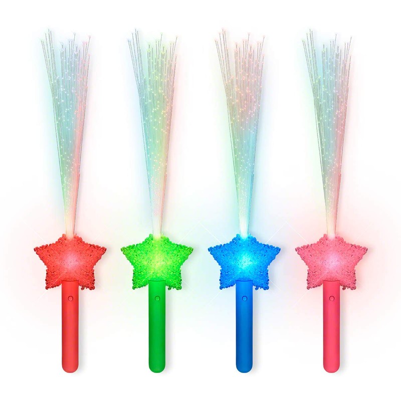 - INCLUDES: Four Assorted Wands- One of each - Red, Blue, Green & Pink Each Features Fun Fiber Optic Strands & Bright Flashing Multicolor LED Lights