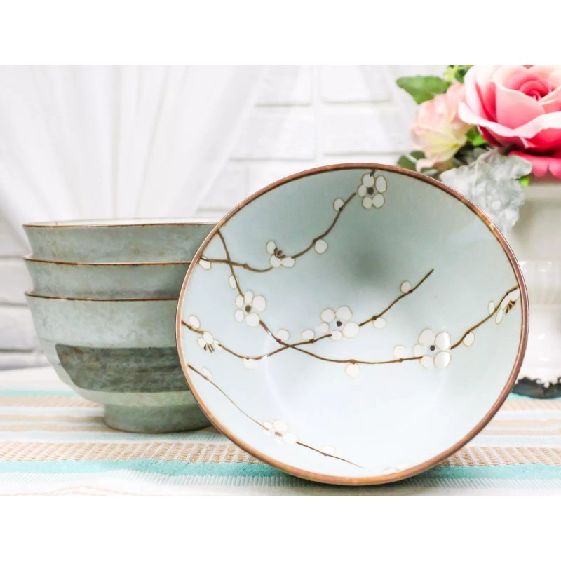 • This set is made in a state of the art factory Japan. Dishwasher and Microwave Safe. Each dinnerware has a lovely soft and creamy duck-egg greeny-blue glaze and a simple brown and white cherry blossom design!