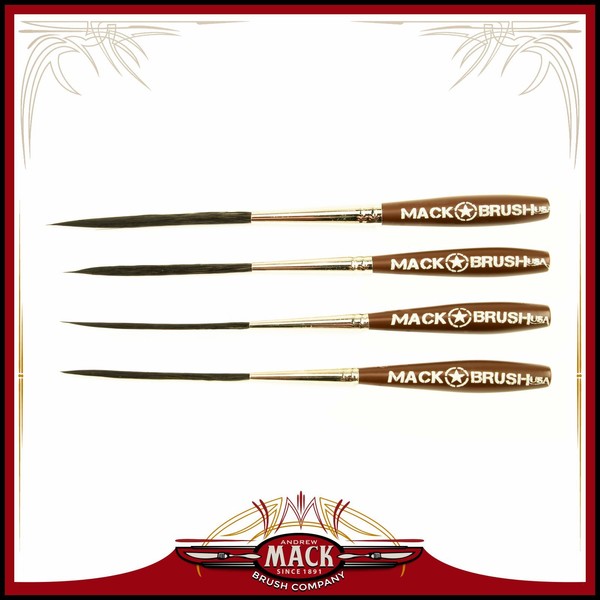 This brush offering, is a modification of the Bobbo Super Quad. Offers the same mixture of hair that is offered in the Bobbo, which is a black synthetic and blue squirrel blend, but with extended hair lengths of 1 3/4" to 2". With the mixture of hair that is used, this provides medium versatility for enamels as well as urethanes without compromising performance. The smaller sizes offer intricate design work capabilities coupled with tight cornering. As you progress to the higher sizes the brush will allow you to do longer line work with thicker consistent line quality. These brushes will offer the individual a high quality striper, outliner, and scroller.