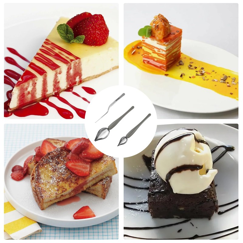 - Sauce spoon: at the end of the stainless steel decorating spoon there is a small opening, put the sauce into the spoon and slide it to get firm, well-defined lines, you can overlay colored lines or combine straight and dotted lines, the angle is controlled by yourself, make everyday life full of rituals
