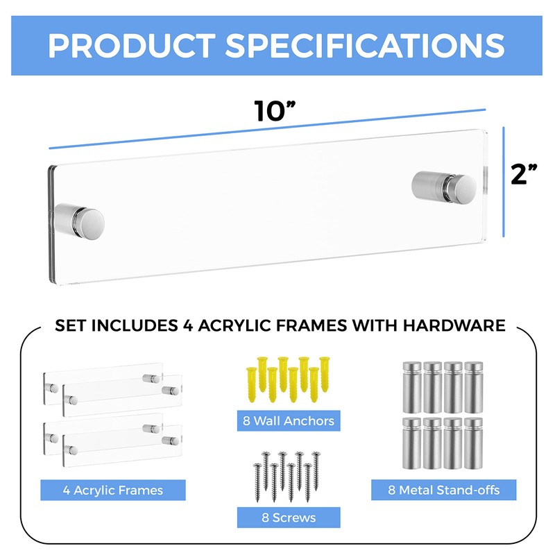Set of 4 - Sturdy & Elegant Acrylic 2 Piece Wall Mount Name Plate Holder, Office Business Door Sign Holder with All Hardware Included, Card Inserts NOT Included, Inner Size, 8” x 2”