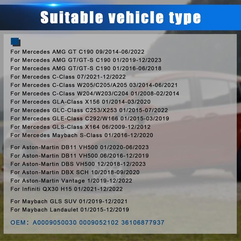 • Compatible models and years: tyre pressure sensor compatible with Mercedes AMG GT C190 09/2014-06/2022 AMG GT/GT-S C190 01/2019-12/2023 AMG GT/GT-SC190 01/2016-06/2018 C-Class 0. 7/2021-12/2022 C-Class W205/C205/A20503/2014-06/2021 C-Class W204/W203/C20401/2008-02/2014 Aston-Martin DB11 VH500 01/20202 0-06 2023 Aston-Martin DB11 VH500 06/2016-12/2019 Aston-Martin DBS VH500 12/2018-12/2023 Aston-Martin DBX SCH 10/2018-09/2020 Aston-Martin Vantage 1/2019-12/2022 Infiniti QX30 H15 01/2021-12/2022