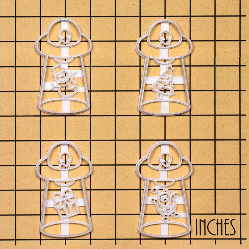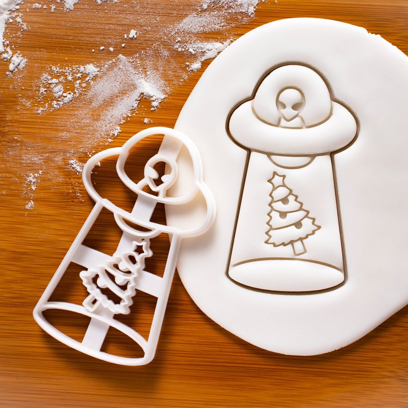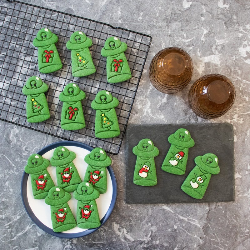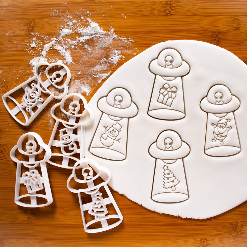 Set of 4 UFO kidnapped Christmas cookie cutters (shapes: Santa, gift, snowman, and Christmas tree), 4 pieces