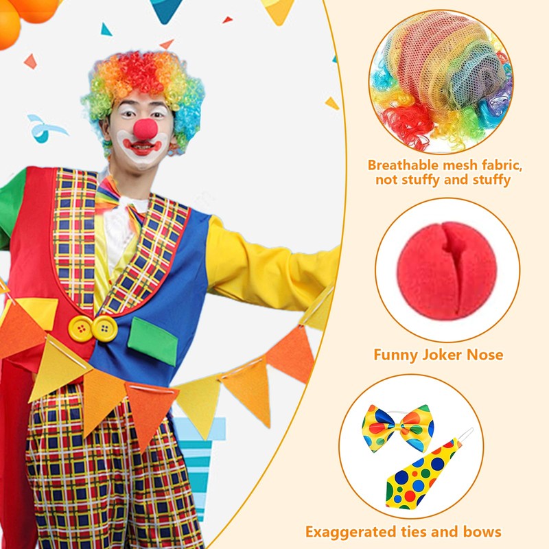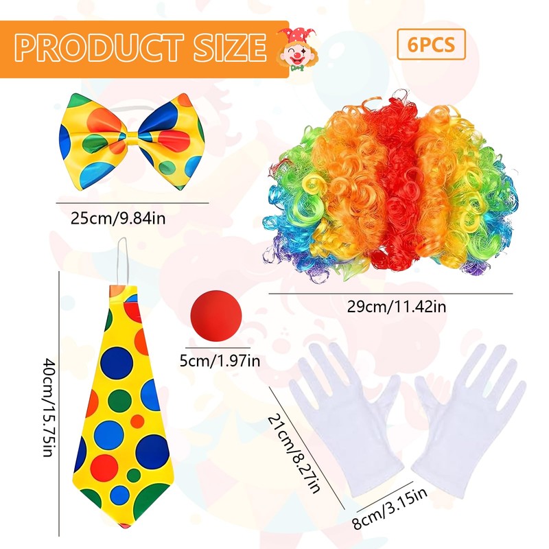 - Clown costume accessory: you will receive 1 clown rainbow wig, 2 white clown gloves, 1 clown bow tie, 1 clown tie and 1 red nose. This classic clown cosplay accessory can help you play the clown well