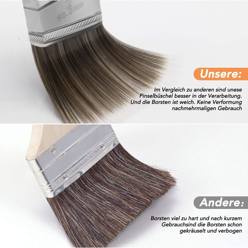 - Premium quality: thanks to the ergonomically shaped and rounded wooden handle, this paint brush fits perfectly in the hand. The high-quality and soft bristle mixture of the flat brush guarantees no bristle loss when painting and ensures a super even painting result, leaves no streaks.