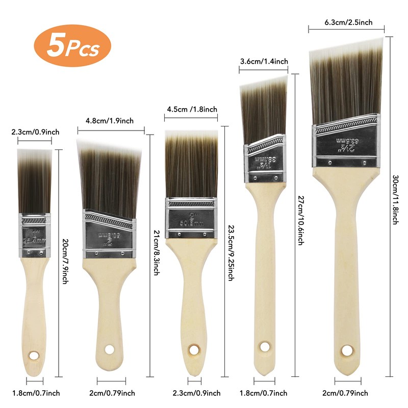 - Package content: this package comes with a total of 5 paint brushes in a size between 2.3 cm to 6.3 cm. Super equipped. And with this paint brush set, you can do both small and large painting work.