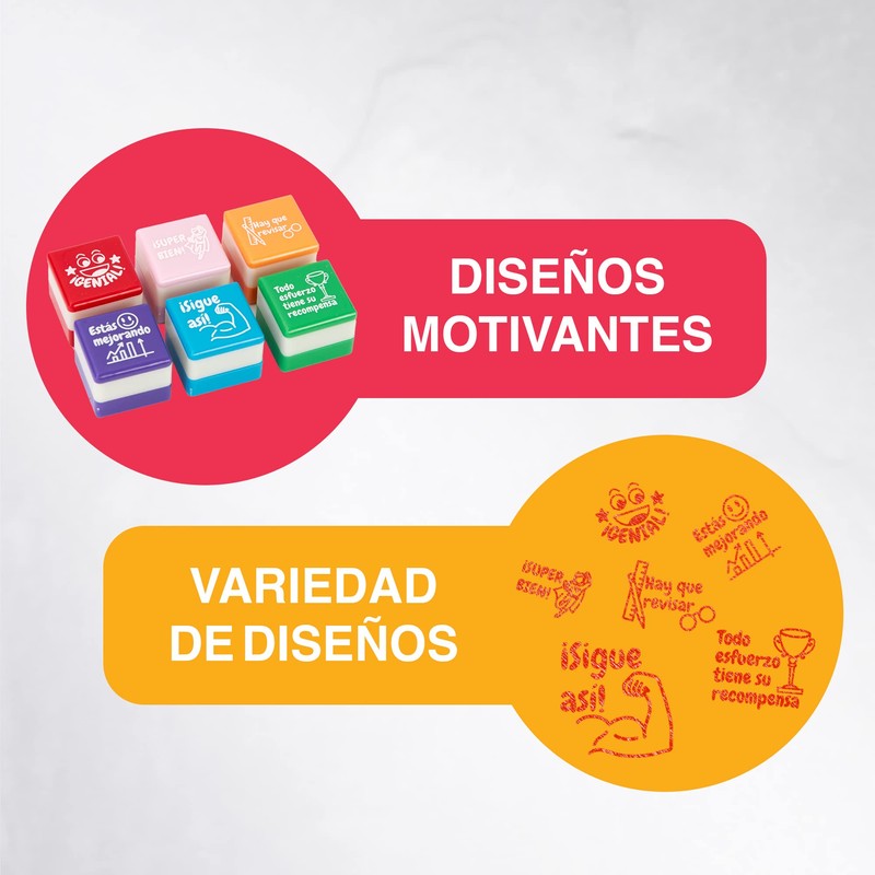 Set of 6 Motivational Square Stamps for Teachers and Children, Children, Assorted Colours, Safe and Durable, 25 mm x 15 mm, for Stimulation and Fun in Learning (6, Spanish)
