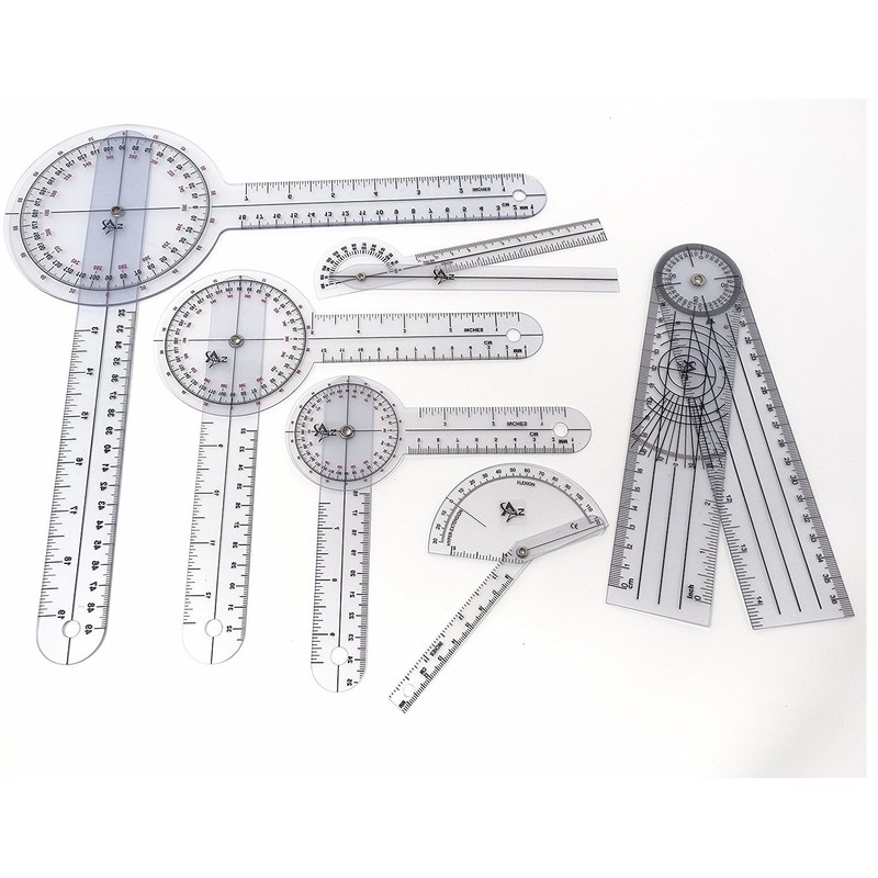 - SET OF 6 PIECES AS SHOWN IN THE PICTURE. Size: 360 Degree Goniometer 6 inch +360 Degree Goniometer 8 inch+360 Degree Goniometer 12 inch+180 degree Goniometer 6 inch + One Finger Goniometer 6 inch + One Spinal Goniometer 8"