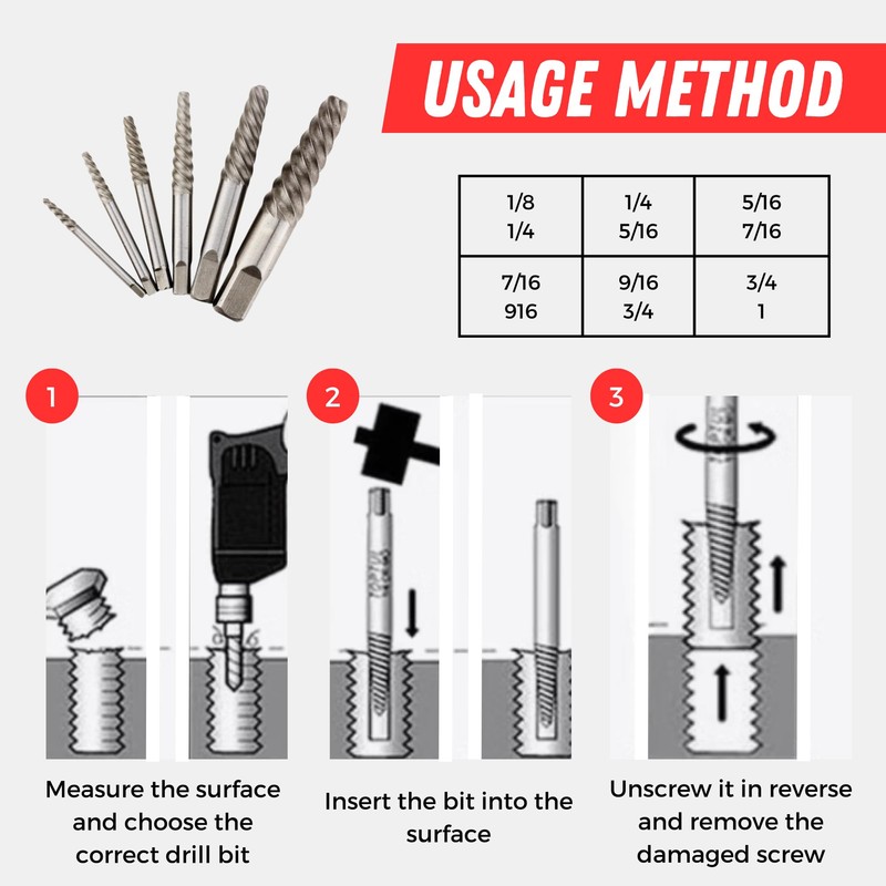 - EASY TO USE: Select the appropriate drill bit, place the drill in reverse on the surface to be extracted, and let the extractor do its work counterclockwise (to the left). In just a few steps, you can remove damaged screws and bolts effortlessly.