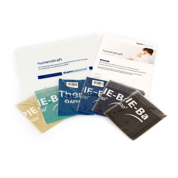 • In this set you will receive 6 different strengths of our TheraPIE band and instructions on how to measure strength and monitor the shoulder in a practical bag. So you have everything at hand for an assessment and/or measurement.