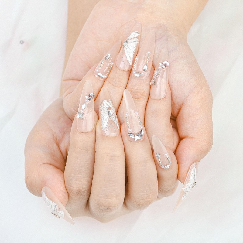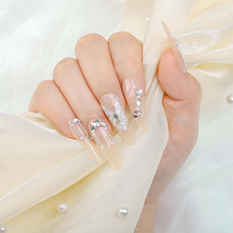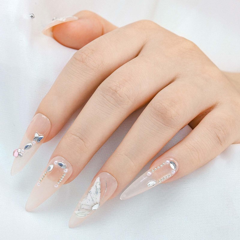 - (Exquisite Design) The long almond shaped false nail has a natural sheer, like your fingernails, and the combination of large rhinestones and silver cubic butterfly, so it goes well with it. The overall sense of taste, perfect for photo shoots and everyday outfits. Handmade chips are highly cost-effective and have a natural finish like your own nail. Even beginners can easily master them. You can create manicure like a salon at home without going out