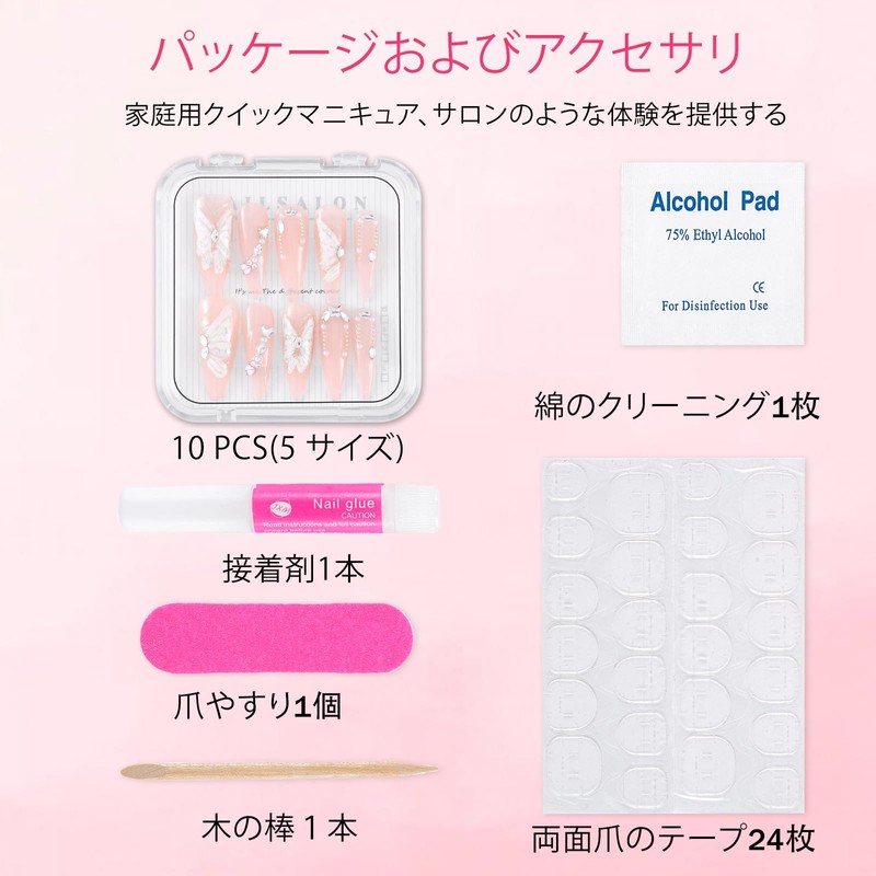 - Package: 10 handmade nails come with a packing box, including 24 double-sided nail tapes, 1 nail file, 1 cotton cleaning, 1 wooden stick, 1 nail glue
