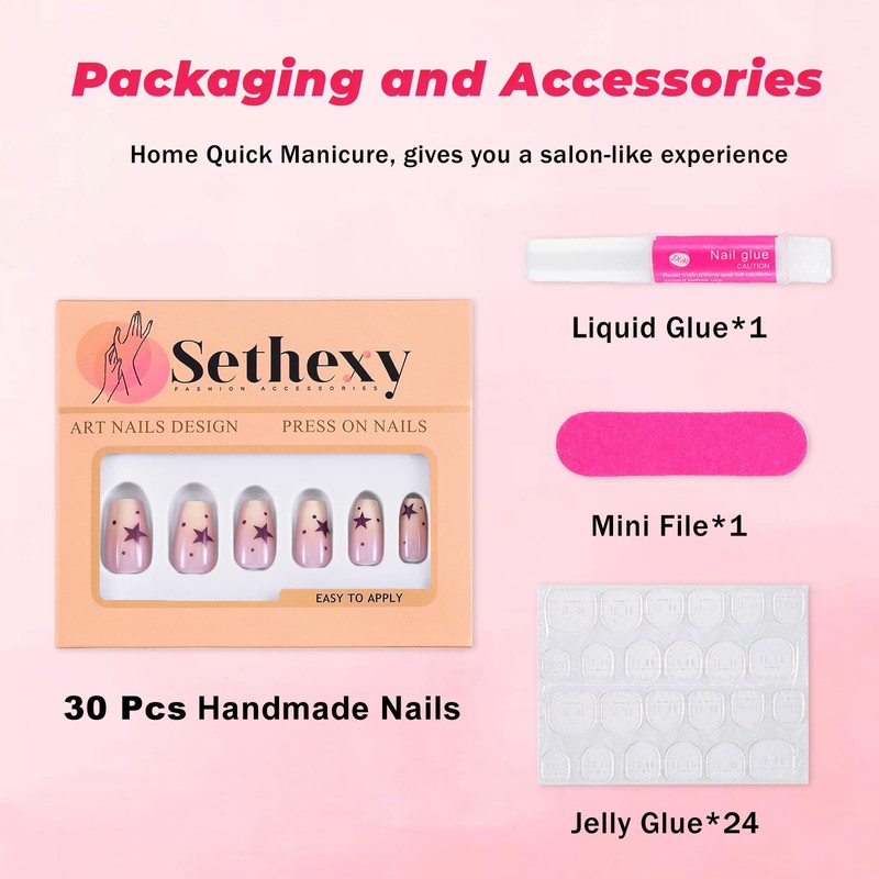 Sethexy Coffin Purple Press on Nail Medium Long - Yellow Gradient, Y2K Star, Polka Dots Design Acrylic False Nail for Women 15 Sizes - 30 Pcs Nail Kit with Glue